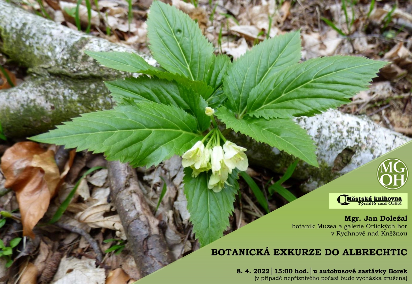 Muzeum a galerie Orlických hor v Rychnově nad Kněžnou ve spolupráci s Městskou knihovnou Týniště nad Orlicí Vás srdečně zve na botanickou exkurzi do Albrechtic nad Orlicí s botanikem Mgr. Janem Doležalem za místní zajímavou květenou. Sraz účastníků 8. dubna 2022 v 15 hodin u autobusové zastávky Borek. Přesná trasa bude dle počasí upřesněna. V případě nepříznivého počasí bude exkurze zrušena.