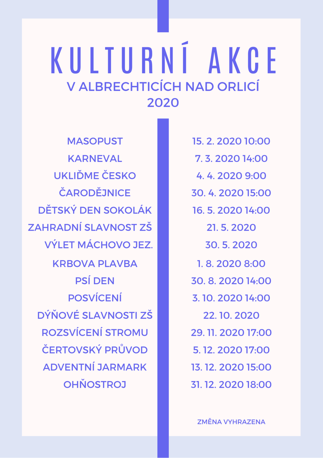 Úvod > Obec > Aktuality > Přehled kulturních akcí v letošním roce v Albrechticích n.O.