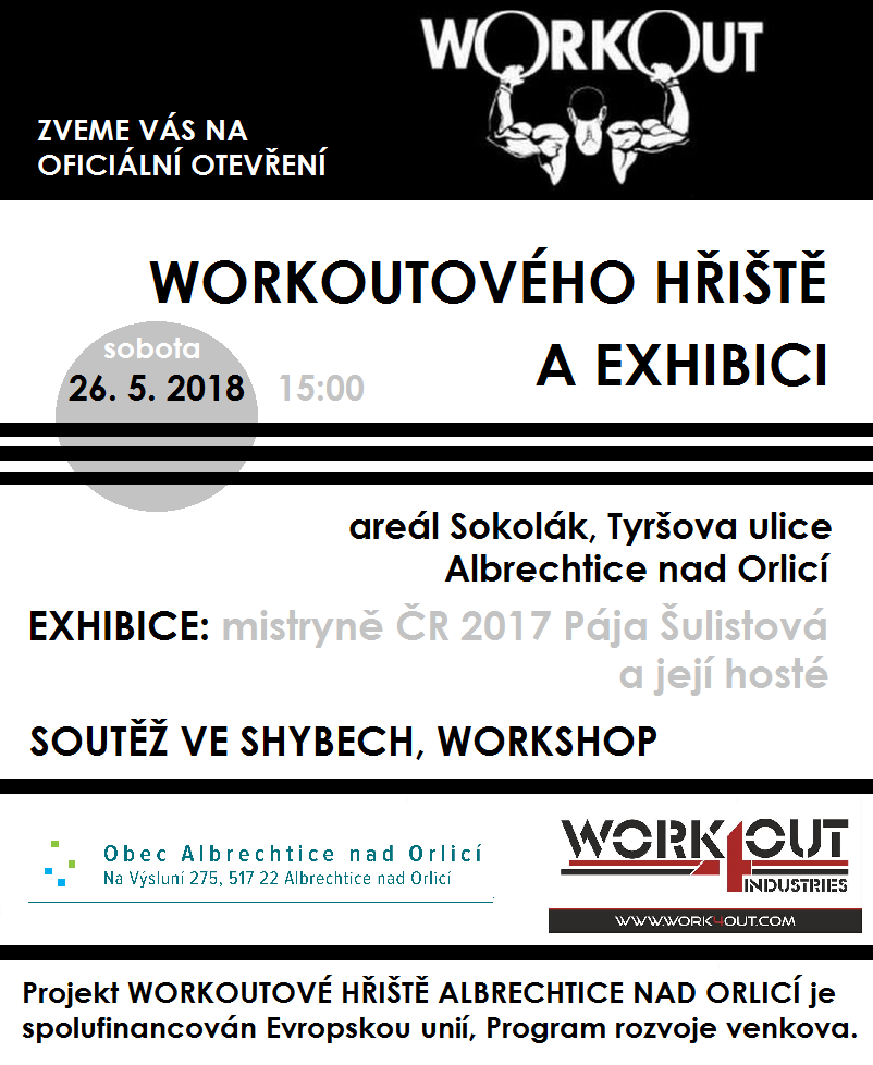 Oficiální otevření workoutového hřiště a exhibice proběhne 26. 5. 2018 od 15.00 hodin. Více informací naleznete ZDE - plakát OFICIÁLNÍ OTEVŘENÍ WORKOUTOVÉHO HŘIŠTĚ A EXHIBICE.