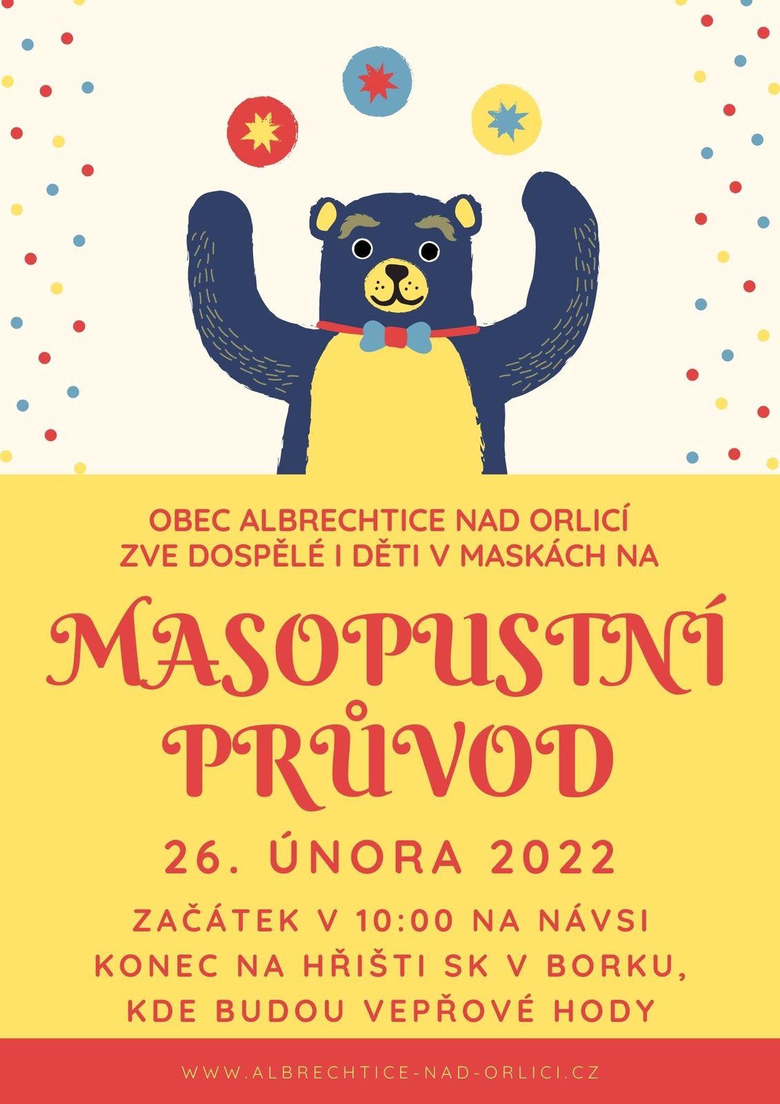 Obec Albrechtice nad Orlicí zve na masopustní průvod po vesnici, který vyrazí v sobotu 26. února v 10 hodin z návsi. Dospělé a děti v kostýmech a maskách i bez nich čekají na konci průvodu vepřové hody na fotbalovém hřišti V Borku.
